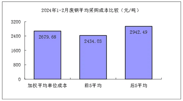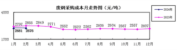 廢鋼2月份加權(quán)平均采購(gòu)成本為2676.13元/噸,環(huán)比下降5.23元/噸,降幅為0.20%。1-2月累計(jì)平均采購(gòu)成本為2679.68元/噸,同比下降136.06元/噸,降幅為4.83%。