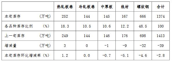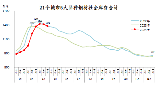 3月下旬,21個(gè)城市5大品種鋼材社會(huì)庫(kù)存1374萬(wàn)噸,環(huán)比減少39萬(wàn)噸,下降2.8%,庫(kù)存繼續(xù)下降;比2月下旬增加7萬(wàn)噸,上升0.7%;比年初增加645萬(wàn)噸,上升88.5%;比上年同期增加143萬(wàn)噸,上升11.6%。