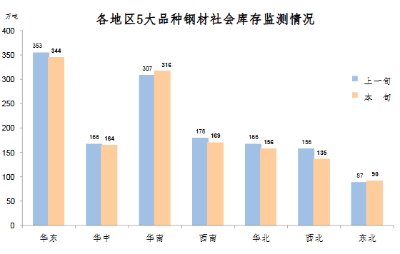 3月下旬,分地區(qū)來(lái)看,七大區(qū)域庫(kù)存環(huán)比各有升降,具體情況為:西北庫(kù)存環(huán)比減少21萬(wàn)噸,下降13.5%,為減量和降幅最大地區(qū);華北減少10萬(wàn)噸,下降6.0%;西南和華東減量均為9萬(wàn)噸,分別下降5.1%和2.5%;華中減少2萬(wàn)噸,下降1.2%;華南增加9萬(wàn)噸,上升2.9%;東北增加3萬(wàn)噸,上升3.4%。