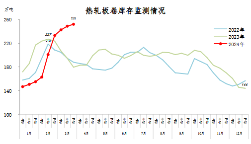 3月下旬,熱軋板卷庫(kù)存252萬(wàn)噸,環(huán)比增加3萬(wàn)噸,上升1.2%,庫(kù)存連續(xù)9旬上升;比2月下旬增加19萬(wàn)噸,上升8.2%;比年初增加108萬(wàn)噸,上升75.0%;比上年同期增加72萬(wàn)噸,上升40.0%。