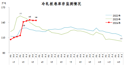 3月下旬,冷軋板卷庫(kù)存144萬(wàn)噸,環(huán)比持平,近期庫(kù)存波動(dòng)不大;比2月下旬增加1萬(wàn)噸,上升0.7%;比年初增加41萬(wàn)噸,上升39.8%;比上年同期增加12萬(wàn)噸,上升9.1%。