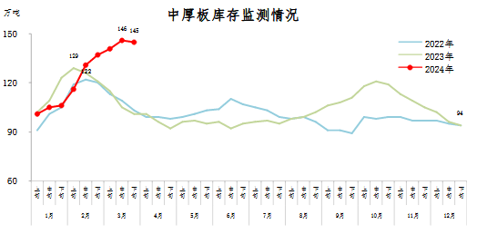 3月下旬,中厚板庫(kù)存145萬(wàn)噸,環(huán)比減少1萬(wàn)噸,下降0.7%,庫(kù)存連續(xù)8旬上升后小幅下降;比2月下旬增加8萬(wàn)噸,上升5.8%;比年初增加51萬(wàn)噸,上升54.3%;比上年同期增加44萬(wàn)噸,大幅上升43.6%。