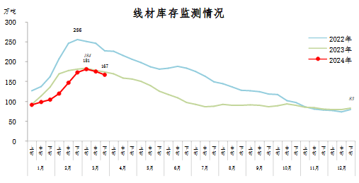 3月下旬,線材庫(kù)存167萬(wàn)噸,環(huán)比減少9萬(wàn)噸,下降5.1%,庫(kù)存繼續(xù)下降;比2月下旬減少6萬(wàn)噸,下降3.5%;比年初增加84萬(wàn)噸,上升101.2%;比上年同期減少7萬(wàn)噸,下降4.0%。