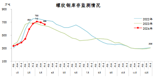 3月下旬,螺紋鋼庫(kù)存666萬(wàn)噸,環(huán)比減少32萬(wàn)噸,下降4.6%,庫(kù)存下降速度有所加快;比2月下旬減少15萬(wàn)噸,下降2.2%;比年初增加361萬(wàn)噸,上升118.4%;比上年同期增加22萬(wàn)噸,上升3.4%。