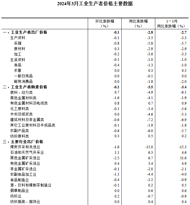 2024年3月份,全國(guó)工業(yè)生產(chǎn)者出廠價(jià)格同比下降2.8%,環(huán)比下降0.1%;工業(yè)生產(chǎn)者購(gòu)進(jìn)價(jià)格同比下降3.5%,環(huán)比下降0.1%。一季度,工業(yè)生產(chǎn)者出廠價(jià)格比上年同期下降2.7%,工業(yè)生產(chǎn)者購(gòu)進(jìn)價(jià)格下降3.4%。