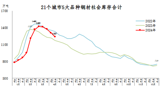 4月中旬,21個城市5大品種鋼材社會庫存1237萬噸,環(huán)比減少71萬噸,下降5.4%,庫存連續(xù)下降;比年初增加508萬噸,上升69.7%;比上年同期增加67萬噸,上升5.7%。