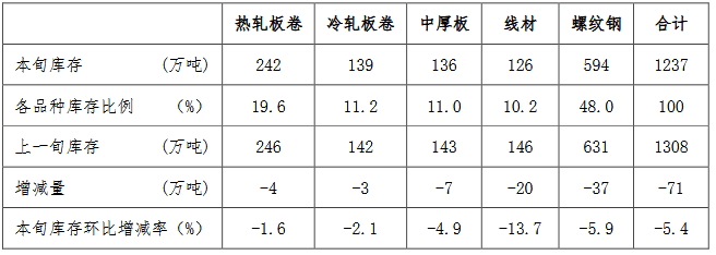 4月中旬,5大品種鋼材社會庫存環(huán)比全部下降,其中螺紋鋼和線材分別為減量和降幅最大品種,具體見下表。