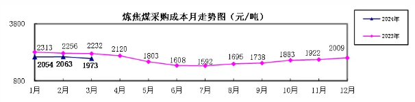 對(duì)標(biāo)企業(yè)煉焦煤3月份加權(quán)平均折算成干基的采購(gòu)成本為1973.49元/噸,環(huán)比下降89.73元/噸,降幅為4.35%。1-3月累計(jì)平均折算成干基的采購(gòu)成本為2037.04元/噸,同比下降230.50元/噸,降幅為10.17%。