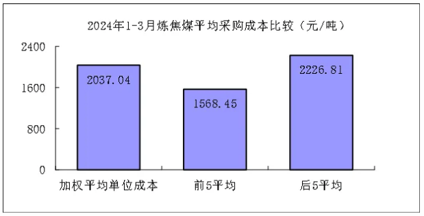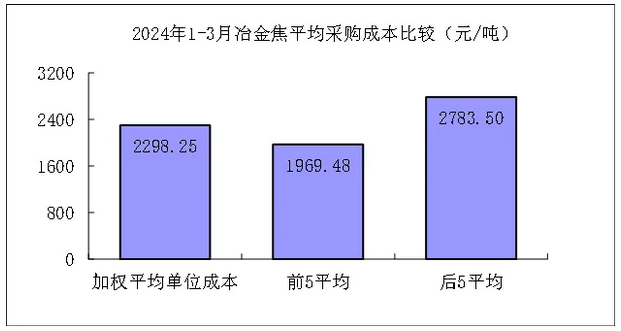 1-3月對(duì)標(biāo)企業(yè)冶金焦平均采購(gòu)成本最低的前5家企業(yè)的加權(quán)平均采購(gòu)成本為1969.48元/噸,比對(duì)標(biāo)企業(yè)平均采購(gòu)成本低328.77元/噸,低于平均采購(gòu)成本14.31%;而采購(gòu)成本最高的5家企業(yè)的加權(quán)平均采購(gòu)成本為2783.50元/噸,比對(duì)標(biāo)企業(yè)平均采購(gòu)成本高485.26元/噸,高于平均采購(gòu)成本21.11%。
