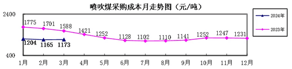 噴吹煤3月份加權(quán)平均折算成干基的采購(gòu)成本為1172.85元/噸,環(huán)比升高7.58元/噸,升幅為0.65 %。1-3月累計(jì)平均折算成干基的采購(gòu)成本為1180.09元/噸,同比下降509.48元/噸,降幅為30.15%。