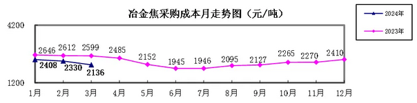 冶金焦3月份加權(quán)平均折算成干基的采購(gòu)成本2136.22元/噸,環(huán)比下降194.13元/噸,降幅為8.33%。1-3月累計(jì)平均折算成干基的采購(gòu)成本為2298.25元/噸,同比下降320.86元/噸,降幅為12.25%。