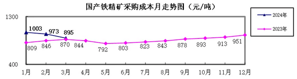 國(guó)產(chǎn)鐵精礦(干基)3月份加權(quán)平均采購(gòu)成本為894.53元/噸,環(huán)比下降78.12元/噸,降幅為8.03%。1-3月累計(jì)平均采購(gòu)成本為961.24元/噸,同比升高116.27元/噸,升幅為13.76%。