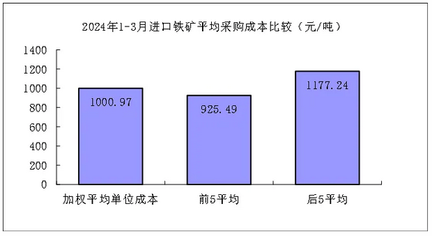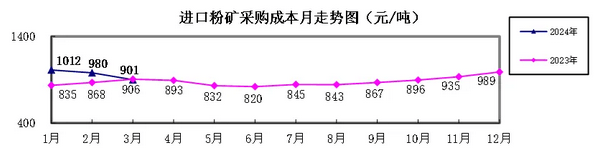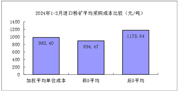 進(jìn)口粉礦3月份加權(quán)平均采購(gòu)成本900.70元/噸,環(huán)比下降79.34元/噸,降幅為8.10%。1-3月累計(jì)平均采購(gòu)成本為961.79元/噸,同比升高91.99元/噸,升幅為10.58%。