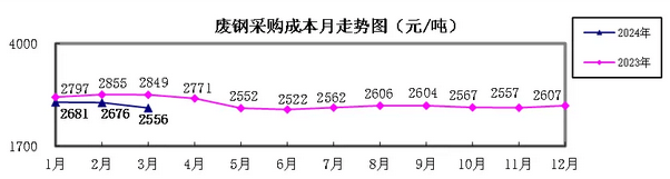 廢鋼3月份加權(quán)平均采購(gòu)成本為2555.67元/噸,環(huán)比下降120.47元/噸,降幅為4.50%。1-3月累計(jì)平均采購(gòu)成本為2639.79元/噸,同比下降178.80元/噸,降幅為6.34%。