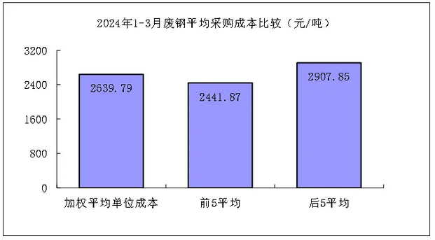 1-3月對(duì)標(biāo)企業(yè)廢鋼平均采購(gòu)成本最低的前5家企業(yè)的加權(quán)平均采購(gòu)成本為2441.87元/噸,比對(duì)標(biāo)企業(yè)平均采購(gòu)成本低197.92元/噸,低于平均采購(gòu)成本7.50%;而采購(gòu)成本最高的5家企業(yè)加權(quán)平均采購(gòu)成本為2907.85元/噸,比對(duì)標(biāo)企業(yè)平均采購(gòu)成本高268.06元/噸,高于平均采購(gòu)成本10.15%。
