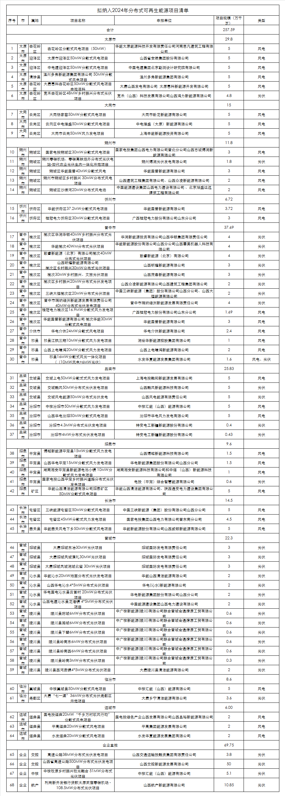 山西省能源局于4月30日發(fā)布了《關于山西省2024年分布式可再生能源項目評審結果的公示》,其中涉及68個項目,規(guī)模合計達到2.5759 GW。其中,光伏項目1396.8MW,風電項目1163.1MW,風光項目16MW。