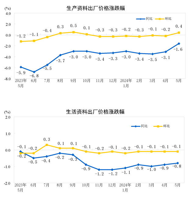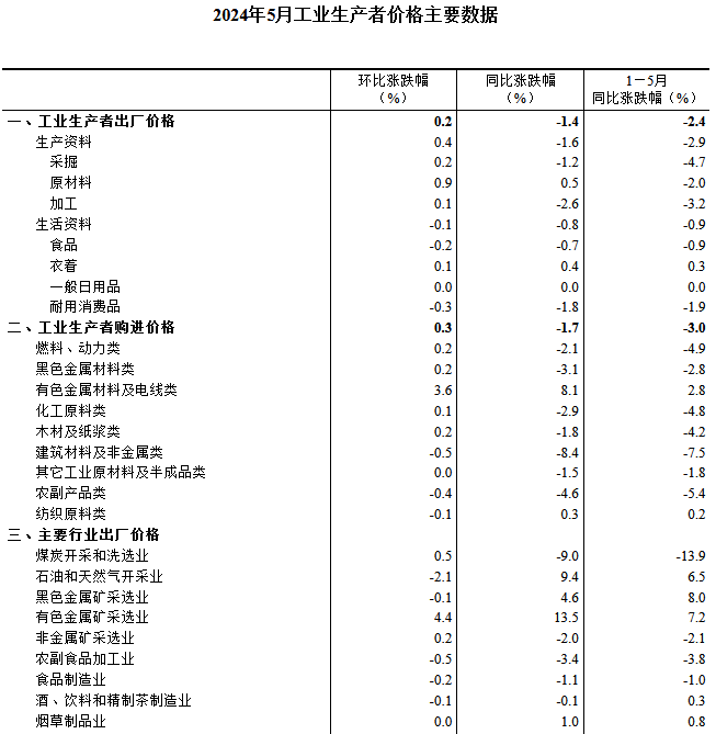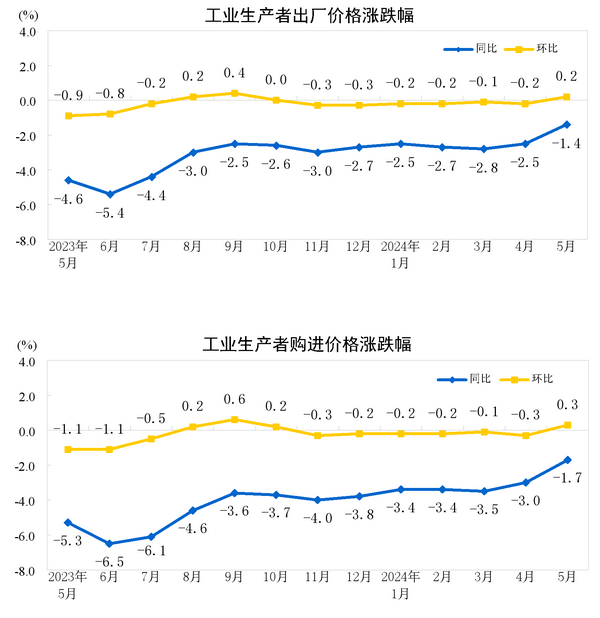 2024年5月份,全國(guó)工業(yè)生產(chǎn)者出廠價(jià)格同比下降1.4%,降幅比上月收窄1.1個(gè)百分點(diǎn),環(huán)比上漲0.2%,上月為下降0.2%;工業(yè)生產(chǎn)者購(gòu)進(jìn)價(jià)格同比下降1.7%,環(huán)比上漲0.3%。1—5月平均,工業(yè)生產(chǎn)者出廠價(jià)格比上年同期下降2.4%,工業(yè)生產(chǎn)者購(gòu)進(jìn)價(jià)格下降3.0%。