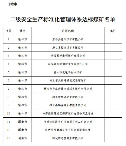 按照《煤礦安全生產(chǎn)標(biāo)準(zhǔn)化管理體系考核定級辦法》及《陜西省煤礦安全生產(chǎn)標(biāo)準(zhǔn)化管理體系考核定級實施細則(試行)》(陜應(yīng)急〔2020〕140號)規(guī)定,經(jīng)資料審查、現(xiàn)場檢查、網(wǎng)上公示,現(xiàn)對達到二級安全生產(chǎn)標(biāo)準(zhǔn)化管理體系的13處煤礦(名單見附件)予以公告,自公告之日起有效期3年,在有效期內(nèi)享受《關(guān)于大力推進煤礦安全生產(chǎn)標(biāo)準(zhǔn)化建設(shè)工作的通知》(安監(jiān)總煤行〔2017〕59號)有關(guān)激勵政策。