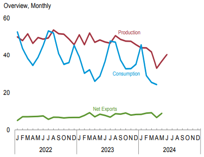 7月29日,美國(guó)能源信息署(EIA)發(fā)布最新《月度能源回顧》報(bào)告顯示,2024年6月份,美國(guó)煤炭產(chǎn)量為4035.3萬(wàn)短噸(3660.76萬(wàn)噸),較上年同期的4714.6萬(wàn)短噸下降14.4%,較前一月的3679.6萬(wàn)短噸增長(zhǎng)9.67%。