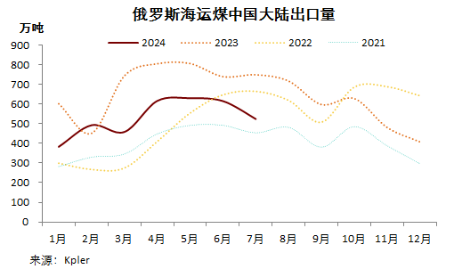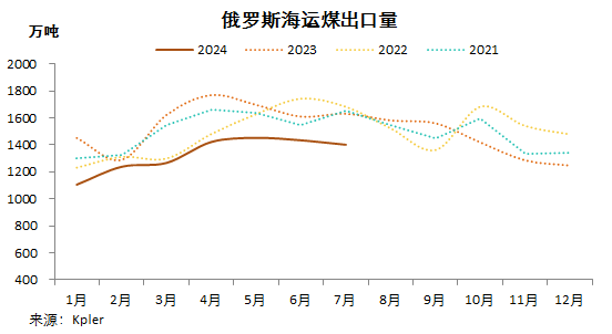 Kpler船舶追蹤數(shù)據(jù)顯示,2024年7月份,俄羅斯海運(yùn)煤出口量1401.35萬噸,環(huán)比降2.28%,同比降14.08%。