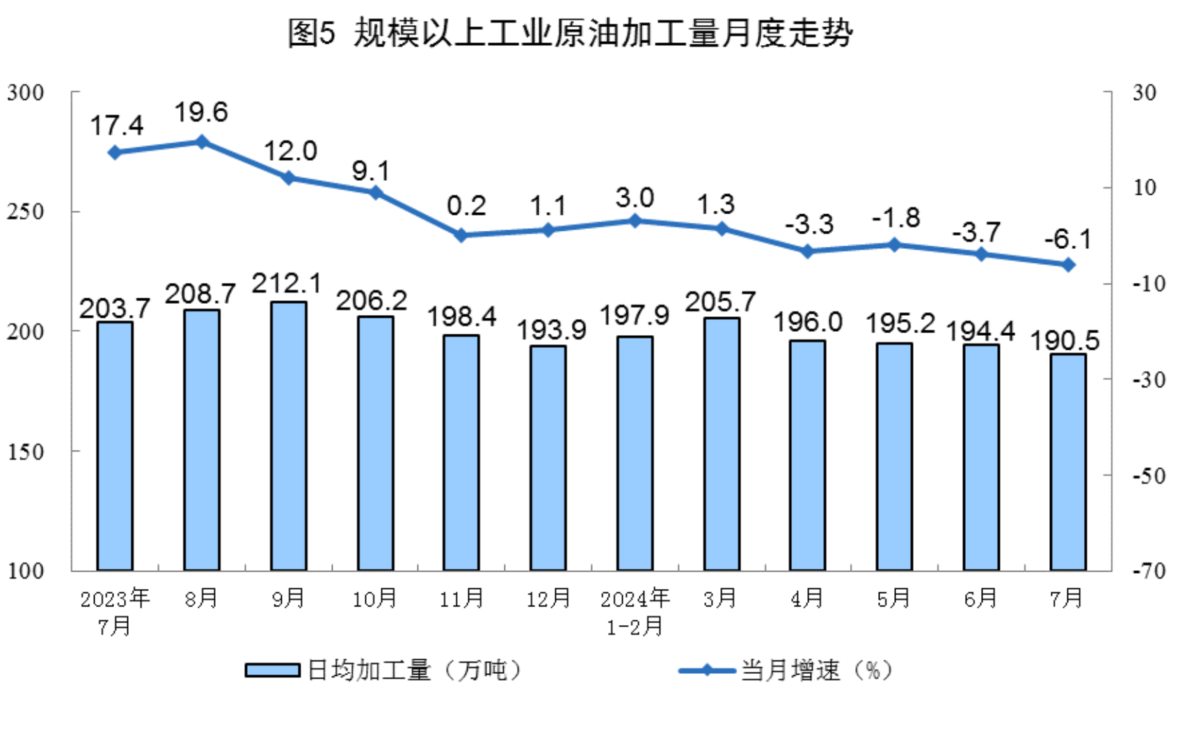 原油加工有所下降。7月份,規(guī)上工業(yè)原油加工量5906萬噸,同比下降6.1%,降幅比6月份擴(kuò)大2.4個(gè)百分點(diǎn);日均加工190.5萬噸。1—7月份,規(guī)上工業(yè)原油加工量41915萬噸,同比下降1.2%。