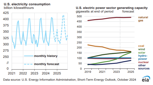 能源信息署預計,2024和2025年,美國電力需求預計將分別達到40930億千瓦時和41630億千瓦時,但這略低于9月份發(fā)布的需求預期值。