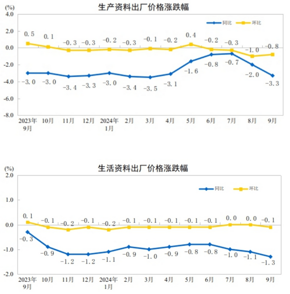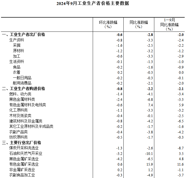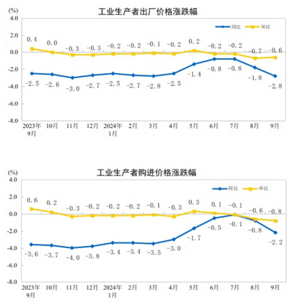 2024年9月份,全國工業(yè)生產(chǎn)者出廠價格同比下降2.8%,環(huán)比下降0.6%;工業(yè)生產(chǎn)者購進(jìn)價格同比下降2.2%,環(huán)比下降0.8%。1—9月平均,工業(yè)生產(chǎn)者出廠價格比上年同期下降2.0%,工業(yè)生產(chǎn)者購進(jìn)價格下降2.1%。