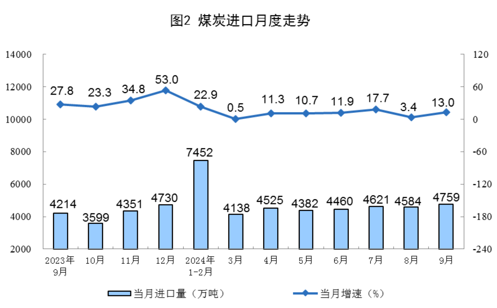 原煤生產(chǎn)增速加快。9月份,規(guī)上工業(yè)原煤產(chǎn)量4.1億噸,同比增長4.4%,增速比8月份加快1.6個(gè)百分點(diǎn);日均產(chǎn)量1381.5萬噸。進(jìn)口煤炭4759萬噸,同比增長13.0%。
