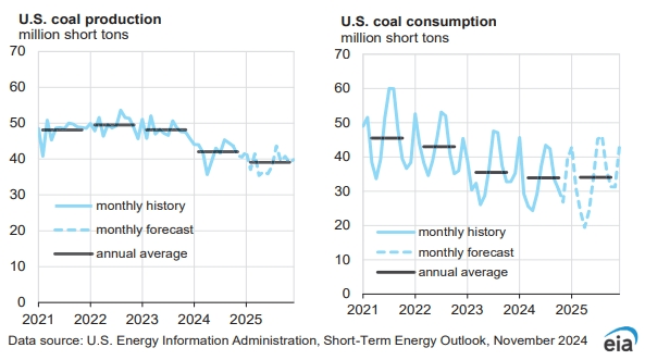 美國能源信息署(EIA)11月13日發(fā)布最新《短期能源展望》報告顯示,2024年,美國煤炭產(chǎn)量為5.047億短噸(4.58億噸),低于前一月預(yù)期值5.1億短噸,較2023年的5.775億短噸下降12.6%。