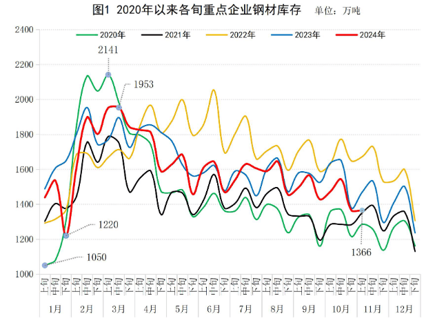 2024年11月上旬,重點(diǎn)統(tǒng)計(jì)鋼鐵企業(yè)(以下簡(jiǎn)稱“重點(diǎn)企業(yè)”)鋼材庫(kù)存量1366萬(wàn)噸,環(huán)比上一旬增加2萬(wàn)噸,增長(zhǎng)0.1%;比年初增加130萬(wàn)噸,增長(zhǎng)10.5%;比上月同旬減少107萬(wàn)噸,下降7.3%;比去年同旬減少103萬(wàn)噸,下降7.0%,比前年同旬減少306萬(wàn)噸,下降18.3%(見(jiàn)圖1)。