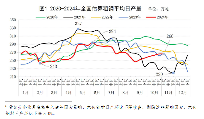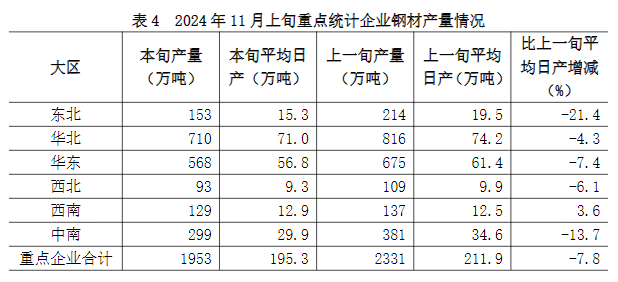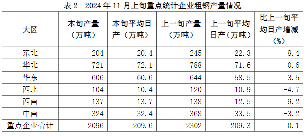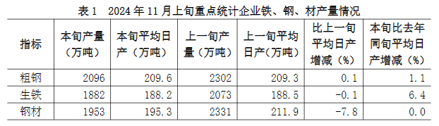 2024年11月上旬,重點(diǎn)統(tǒng)計(jì)鋼鐵企業(yè)共生產(chǎn)粗鋼2096萬(wàn)噸,平均日產(chǎn)209.6萬(wàn)噸,日產(chǎn)環(huán)比增長(zhǎng)0.1%;生鐵1882萬(wàn)噸,平均日產(chǎn)188.2萬(wàn)噸,日產(chǎn)環(huán)比下降0.1%;鋼材1953萬(wàn)噸,平均日產(chǎn)195.3萬(wàn)噸,日產(chǎn)環(huán)比下降7.8%1(見(jiàn)表1)。
