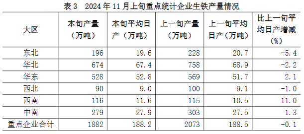 11月上旬六大地區(qū)中,華東、西南、中南地區(qū)重點(diǎn)統(tǒng)計(jì)企業(yè)生鐵日產(chǎn)量較上一旬有所增長(zhǎng),其它地區(qū)均有所下降(詳見(jiàn)表3),具體為: