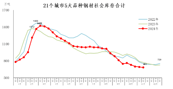 11月中旬,21個(gè)城市5大品種鋼材社會(huì)庫存684萬噸,環(huán)比減少9萬噸,下降1.3%,庫存繼續(xù)小幅下降;比年初減少45萬噸,下降6.2%;比上年同期減少89萬噸,下降11.5%。