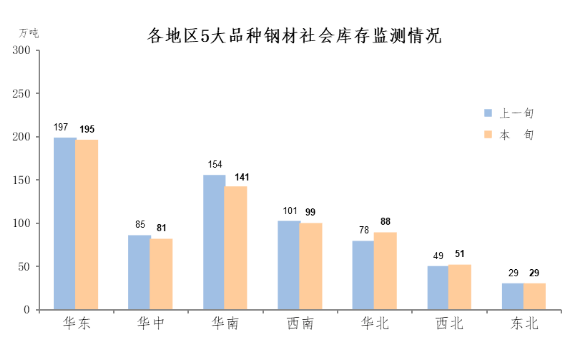 11月中旬,分地區(qū)來看,七大區(qū)域鋼材庫存環(huán)比各有升降,具體情況為:華南庫存環(huán)比減少13萬噸,下降8.4%,為減量和減幅最大地區(qū);華北增加10萬噸,上升12.8%,為增量和增幅最大地區(qū);華東減少2萬噸,下降1.0%;華中減少4萬噸,下降4.7%;西南減少2萬噸,下降2.0%;東北環(huán)比持平;西北增加2萬噸,上升4.1%。