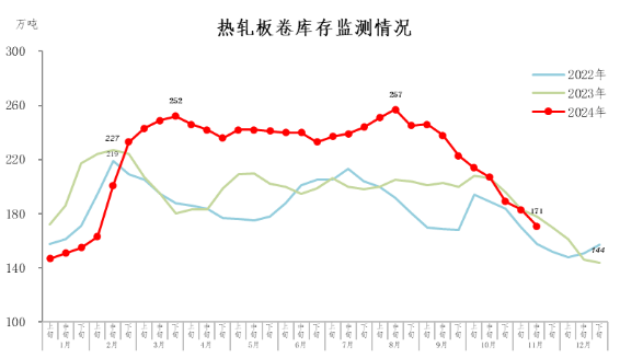 11月中旬,熱軋板卷庫存171萬噸,環(huán)比減少12萬噸,下降6.6%,庫存降幅擴(kuò)大;比年初增加27萬噸,上升18.8%;比上年同期減少7萬噸,下降3.9%。