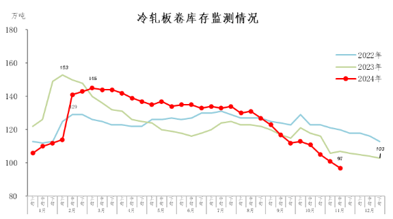 11月中旬,冷軋板卷庫存97萬噸,環(huán)比減少4萬噸,下降4.0%,庫存持續(xù)下降;比年初減少6萬噸,下降5.8%;比上年同期減少10萬噸,下降9.3%。