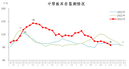 11月中旬,中厚板庫存95萬噸,環(huán)比減少4萬噸,下降4.0%,降幅略有擴(kuò)大;比年初增加1萬噸,上升1.1%;比上年同期減少14萬噸,下降12.8%。
