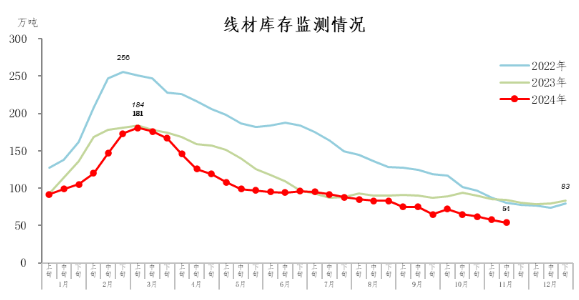 11月中旬,線材庫存54萬噸,環(huán)比減少4萬噸,下降6.9%,庫存繼續(xù)下降;比年初減少29萬噸,下降34.9%;比上年同期減少30萬噸,下降35.7%。