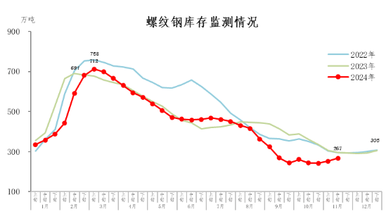 11月中旬,螺紋鋼庫存267萬噸,環(huán)比增加15萬噸,上升6.0%,庫存連續(xù)上升;比年初減少38萬噸,下降12.5%;比上年同期減少28萬噸,下降9.5%。