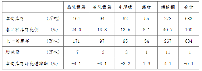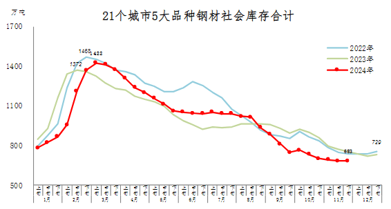 11月下旬,21個(gè)城市5大品種鋼材社會(huì)庫存683萬噸,環(huán)比減少1萬噸,下降0.1%,庫存變化不大;比10月下旬減少17萬噸,下降2.4%;比年初減少46萬噸,下降6.3%;比上年同期減少72萬噸,下降9.5%。