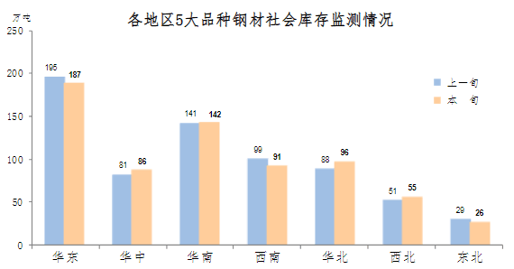 11月下旬,分地區(qū)來看,七大區(qū)域鋼材庫存環(huán)比各有升降,具體情況為:西南、華東庫存環(huán)比均減少8萬噸,分別下降8.1%和4.1%,為減量最大地區(qū);東北減少3萬噸,下降10.3%,為降幅最大地區(qū);華北增加8萬噸,上升9.1%,為增量和升幅最大地區(qū);華中增加5萬噸,上升6.2%;西北增加4萬噸,上升7.8%;華南增加1萬噸,上升0.7%。