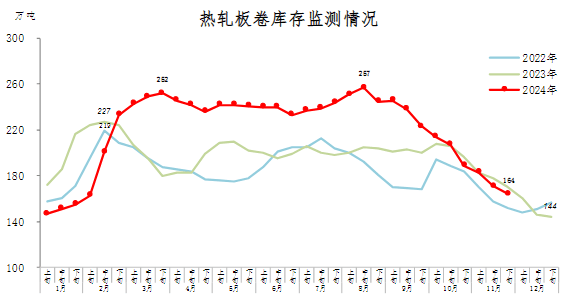 11月下旬,熱軋板卷庫存164萬噸,環(huán)比減少7萬噸,下降4.1%,庫存連續(xù)下降;比10月下旬減少25萬噸,下降13.2%;比年初增加20萬噸,上升13.9%;比上年同期減少6萬噸,下降3.5%。