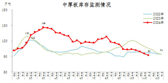 11月下旬,中厚板庫存92萬噸,環(huán)比減少3萬噸,下降3.2%;比10月下旬減少10萬噸,下降9.8%;比年初減少2萬噸,下降2.1%;比上年同期減少13萬噸,下降12.4%。