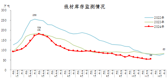 11月下旬,線材庫存55萬噸,環(huán)比增加1萬噸,上升1.9%,庫存由降轉(zhuǎn)升;比10月下旬減少7萬噸,下降11.3%;比年初減少28萬噸,下降33.7%;比上年同期減少26萬噸,下降32.1%。