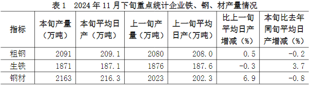 2024年11月下旬,重點統(tǒng)計鋼鐵企業(yè)共生產(chǎn)粗鋼2091萬噸,平均日產(chǎn)209.1萬噸,日產(chǎn)環(huán)比增長0.5%;生鐵1871萬噸,平均日產(chǎn)187.1萬噸,日產(chǎn)環(huán)比下降0.3%;鋼材2163萬噸,平均日產(chǎn)216.3萬噸,日產(chǎn)環(huán)比增長6.9%1(見表1)。