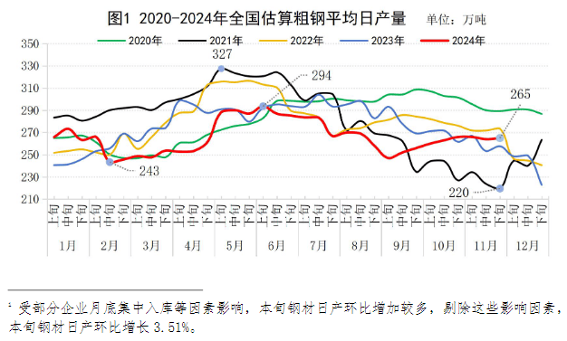 據(jù)此估算,本旬全國日產(chǎn)粗鋼265萬噸、環(huán)比增長0.5%(見圖1),日產(chǎn)生鐵226萬噸、環(huán)比下降0.3%,日產(chǎn)鋼材396萬噸、環(huán)比增長1.8%。1受部分企業(yè)月底集中入庫等因素影響,本旬鋼材日產(chǎn)環(huán)比增加較多,剔除這些影響因素,本旬鋼材日產(chǎn)環(huán)比增長3.51%。