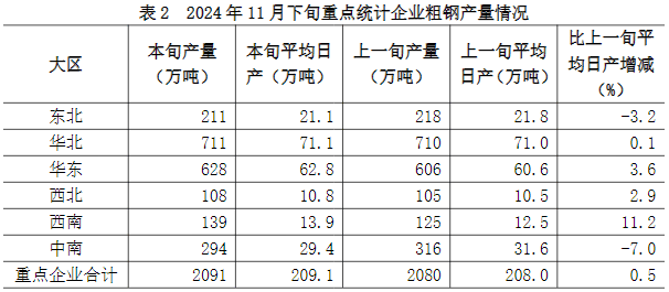11月下旬六大地區(qū)中,除東北、中南地區(qū)重點統(tǒng)計企業(yè)粗鋼日產(chǎn)量較上一旬下降外,其它地區(qū)均有所增長(詳見表2),具體為: