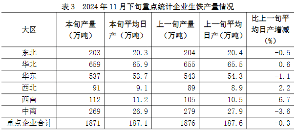 11月下旬六大地區(qū)中,東北、華東、中南地區(qū)重點統(tǒng)計企業(yè)生鐵日產(chǎn)量較上一旬有所下降,其它地區(qū)均有所增長(詳見表3),具體為:
