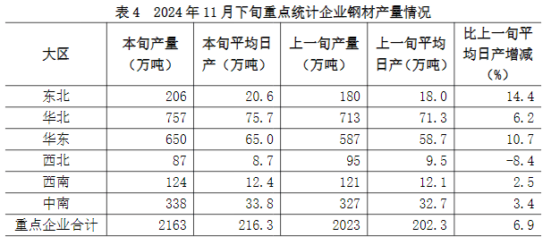 11月下旬六大地區(qū)中,除西北地區(qū)重點統(tǒng)計企業(yè)鋼材日產(chǎn)量較上一旬有所下降外,其它地區(qū)均有不同程度增長(詳見表4),具體為: