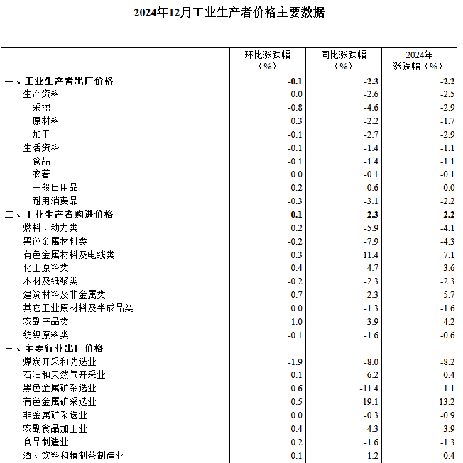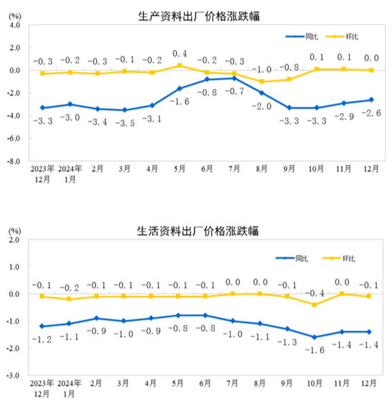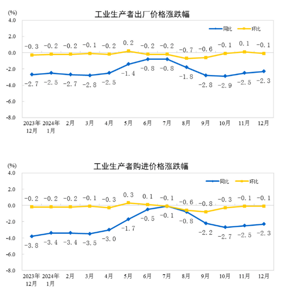 2024年12月份,全國(guó)工業(yè)生產(chǎn)者出廠價(jià)格和購(gòu)進(jìn)價(jià)格同比均下降2.3%,降幅比上月均收窄0.2個(gè)百分點(diǎn);環(huán)比均下降0.1%。2024年全年,工業(yè)生產(chǎn)者出廠價(jià)格和購(gòu)進(jìn)價(jià)格均下降2.2%,降幅比上年分別收窄0.8、1.4個(gè)百分點(diǎn)。